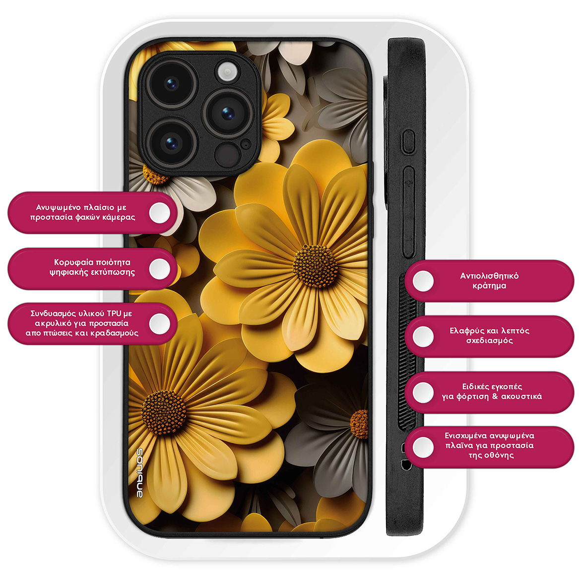 Η Θήκη Sonique 3D flower Series προσφέρει μοναδική κομψότητα και ασφάλεια για το κινητό σας. Το εκλεπτυσμένο σχέδιο 3D flower σε συνδυασμό με την ψηφιακή εκτύπωση υψηλής ποιότητας δημιουργεί ένα εντυπωσιακό αποτέλεσμα που δεν ξεθωριάζει με την πάροδο του χρόνου. Κατασκευασμένη από ανθεκτική σιλικόνη με ακρυλικό πίσω μέρος, η θήκη αυτή προστατεύει αποτελεσματικά τη συσκευή σας από καθημερινές φθορές και γρατσουνιές, ενώ παράλληλα διατηρεί την πολυτελή της εμφάνιση.Επιπλέον, η θήκη διαθέτει αντιολισθητικό κράτημα, προσφέροντας ασφαλή αίσθηση στο χέρι και μειώνοντας τον κίνδυνο ατυχημάτων από γλιστρήματα. Διατίθεται σε ποικιλία σχεδίων και χρωμάτων, για να βρείτε το ιδανικό στυλ που ταιριάζει με την προσωπικότητά σας. Απογειώστε την εμφάνιση και την προστασία του κινητού σας με την Sonique 3D flower, που συνδυάζει μοντέρνο design και πρακτικότητα.