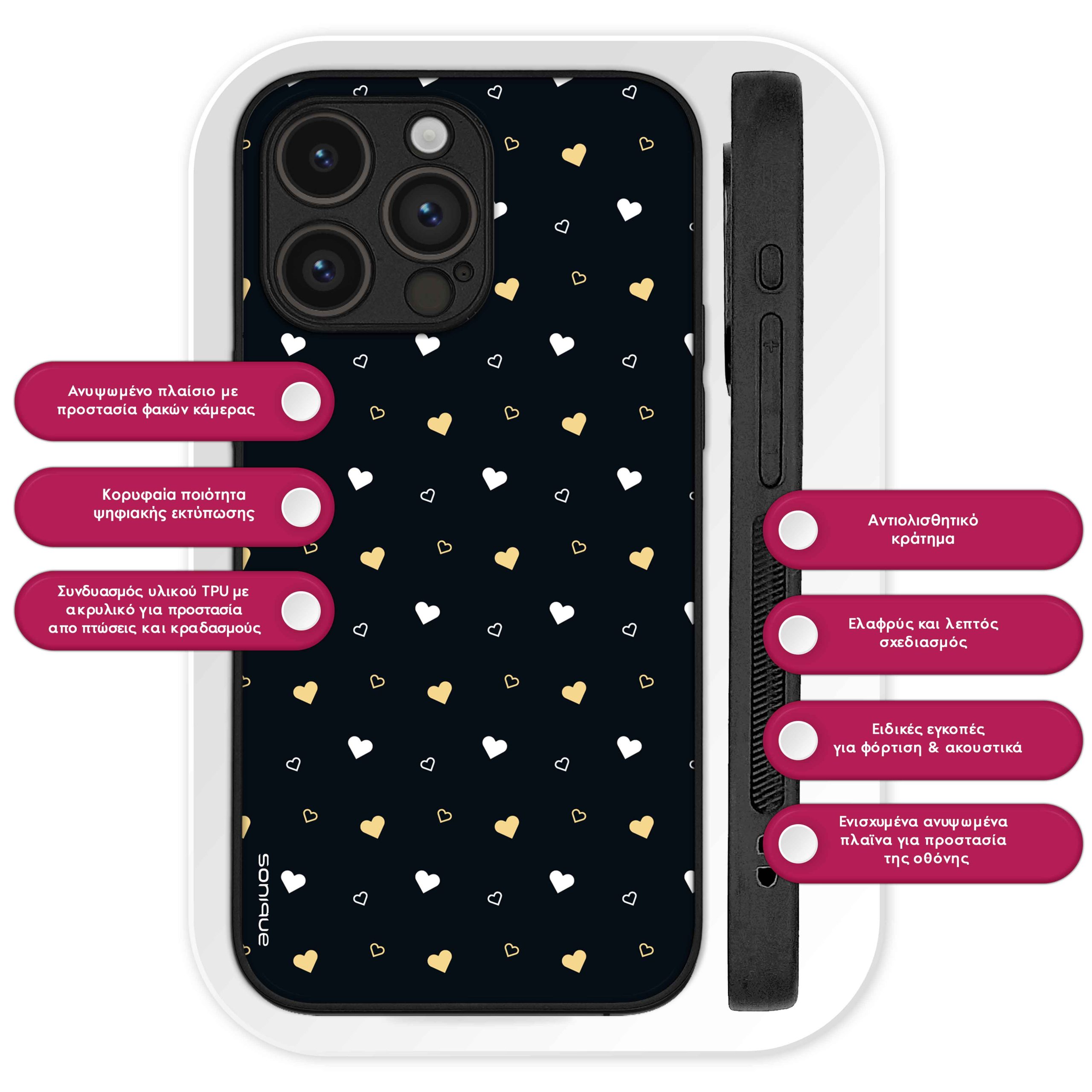 Η Θήκη Sonique Ηeart Series προσφέρει μοναδική κομψότητα και ασφάλεια για το κινητό σας. Το εκλεπτυσμένο σχέδιο Ηeart σε συνδυασμό με την ψηφιακή εκτύπωση υψηλής ποιότητας δημιουργεί ένα εντυπωσιακό αποτέλεσμα που δεν ξεθωριάζει με την πάροδο του χρόνου. Κατασκευασμένη από ανθεκτική σιλικόνη με ακρυλικό πίσω μέρος, η θήκη αυτή προστατεύει αποτελεσματικά τη συσκευή σας από καθημερινές φθορές και γρατσουνιές, ενώ παράλληλα διατηρεί την πολυτελή της εμφάνιση.Επιπλέον, η θήκη διαθέτει αντιολισθητικό κράτημα, προσφέροντας ασφαλή αίσθηση στο χέρι και μειώνοντας τον κίνδυνο ατυχημάτων από γλιστρήματα. Διατίθεται σε ποικιλία σχεδίων και χρωμάτων, για να βρείτε το ιδανικό στυλ που ταιριάζει με την προσωπικότητά σας. Απογειώστε την εμφάνιση και την προστασία του κινητού σας με την Sonique Ηeart, που συνδυάζει μοντέρνο design και πρακτικότητα.